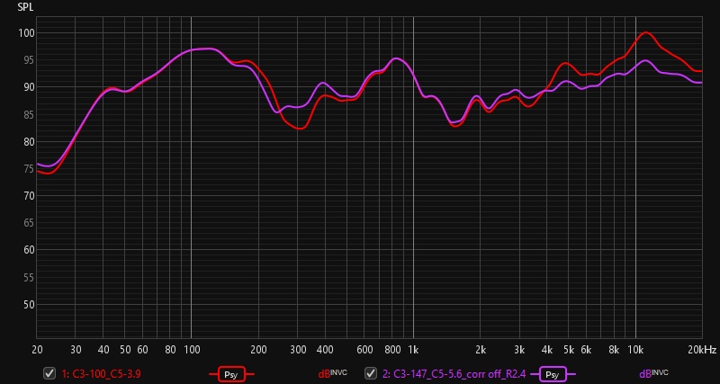 En rouge c’est la première mesure après avoir remplacé les condensateurs de 4µF par les MKT de 3.9µF, en violet les modifications C3, C5 et R1 déduites uniquement des mesures. J’ai légèrement gagné en linéarité, j’espère gagner aussi sur le rendu.