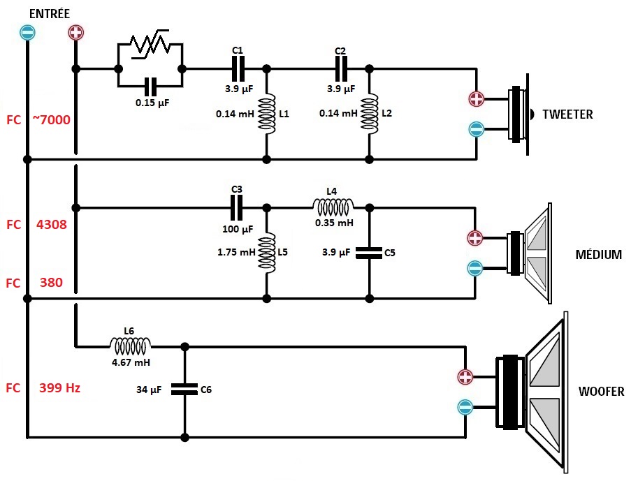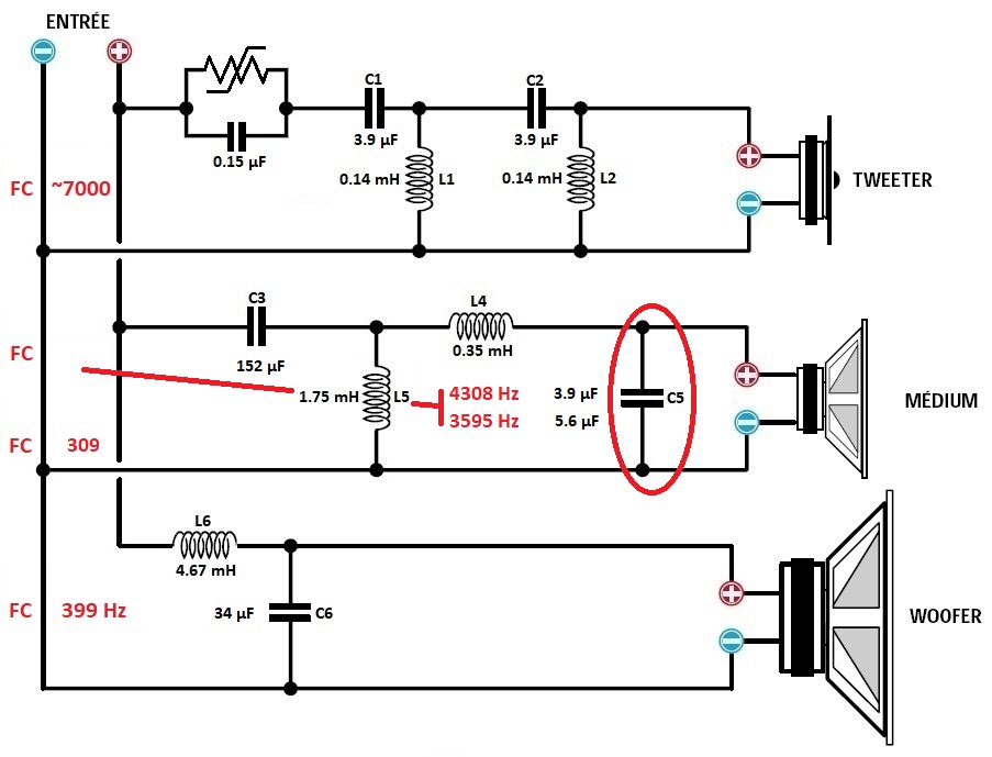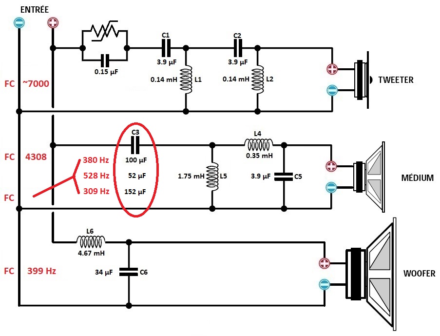 - Médium : je réutilise le condensateur de 100 µF du grave pour le passe haut afin de rapprocher la FC vers les 400 Hz.