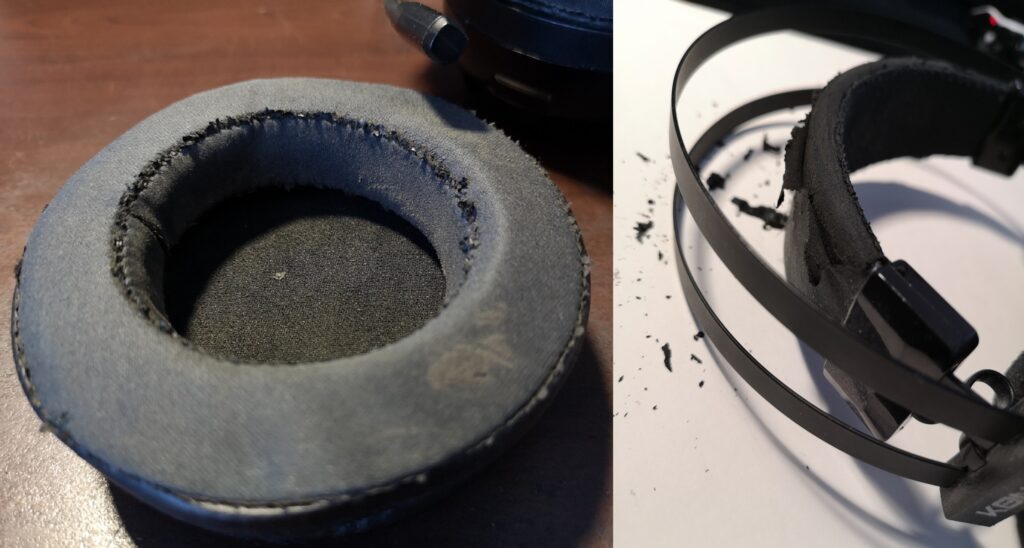 L’utilisation « intensive » n’aura pas préservé le simili cuir du casque qui s’est très vite mis à se dégrader et partir en lambeaux en moins d’un an. Obliger d’éplucher complètement les coussinets et le bandeau pour ne pas avoir des morceaux de simili cuir plein les oreilles ou dans les cheveux en fin de partie.