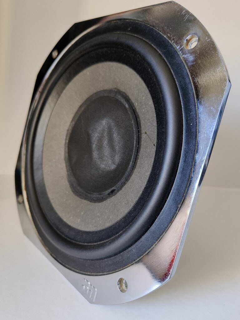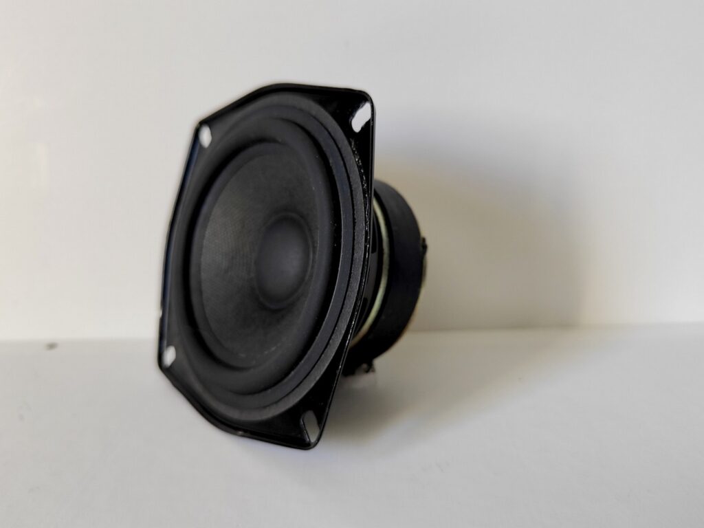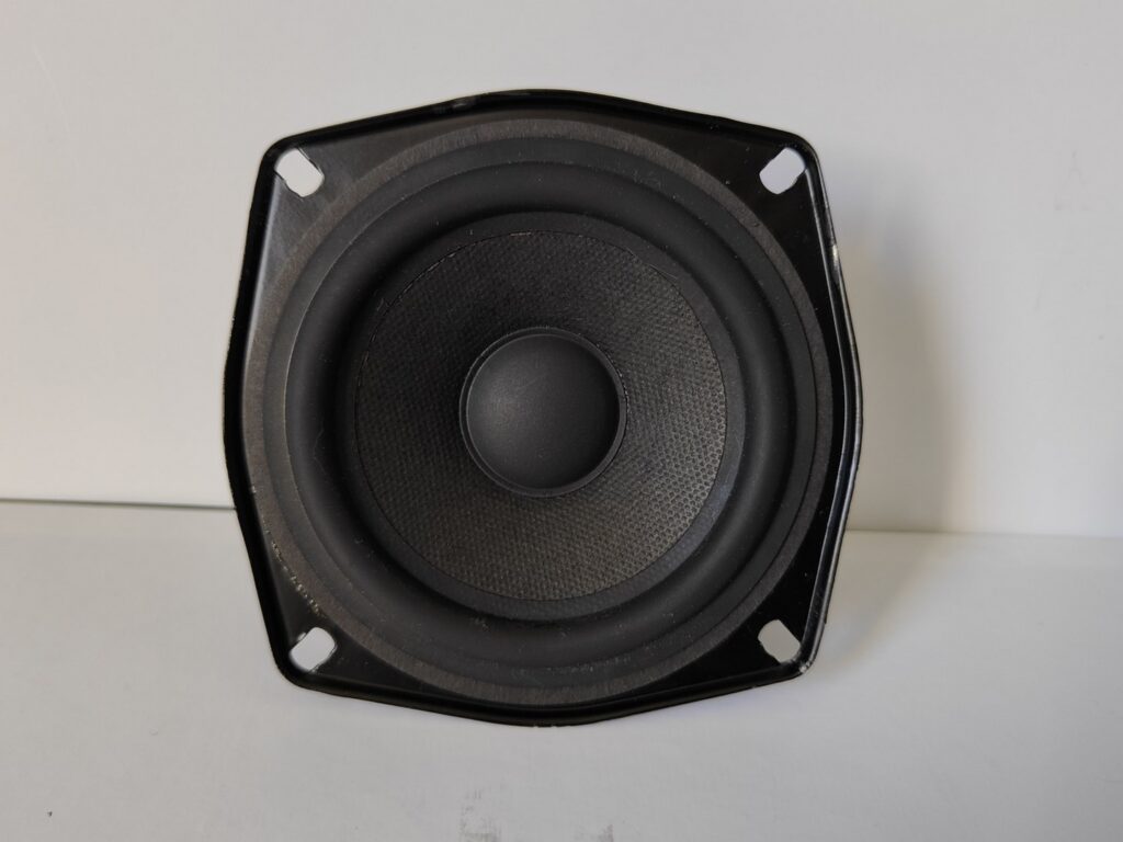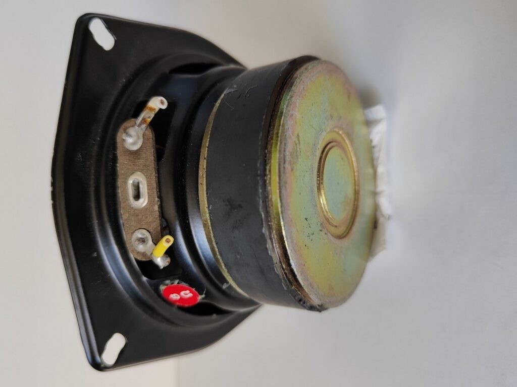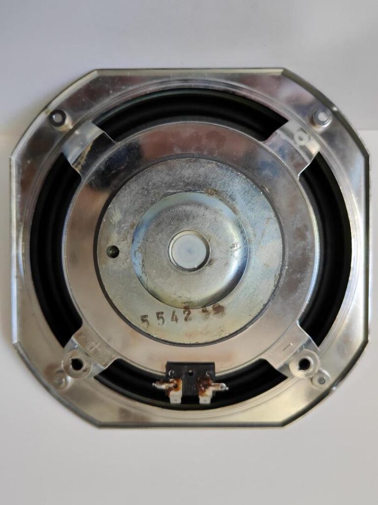 Dommage que le médium n’ait pas d’information inscrite à pars le 8 ohm. Seule piste, une correspondance avec d’autres modèles de la marque, de la même époque, et surtout la forme du bornier laisse à penser qu’il s’agirait d’un Faital contrairement au test du journaliste qui parlait d’un Philips.