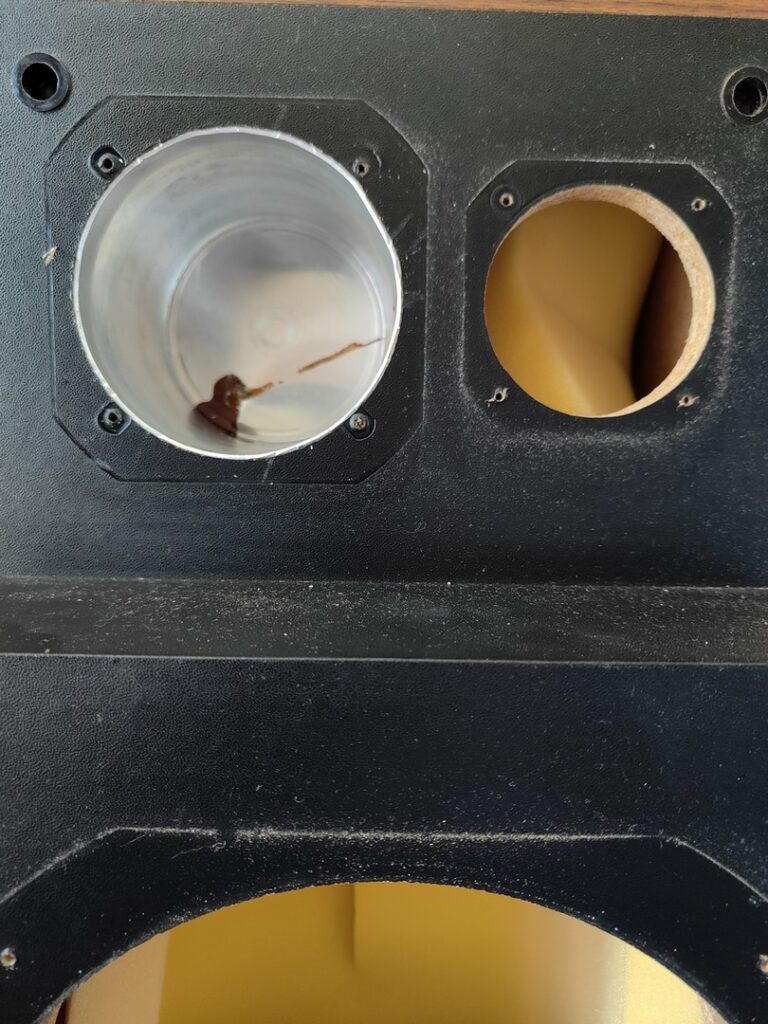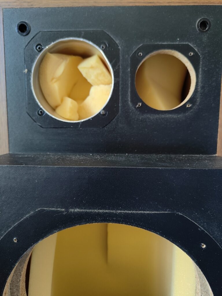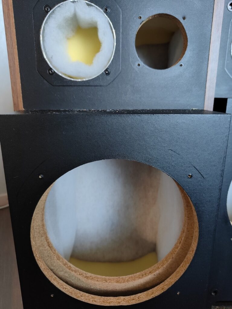 La deuxième enceinte n’a pas de mousse à l’intérieur, elle a été ouverte. Au bout d’une si longue vie, il est rare de trouver quelque chose d’identique à son premier jour.