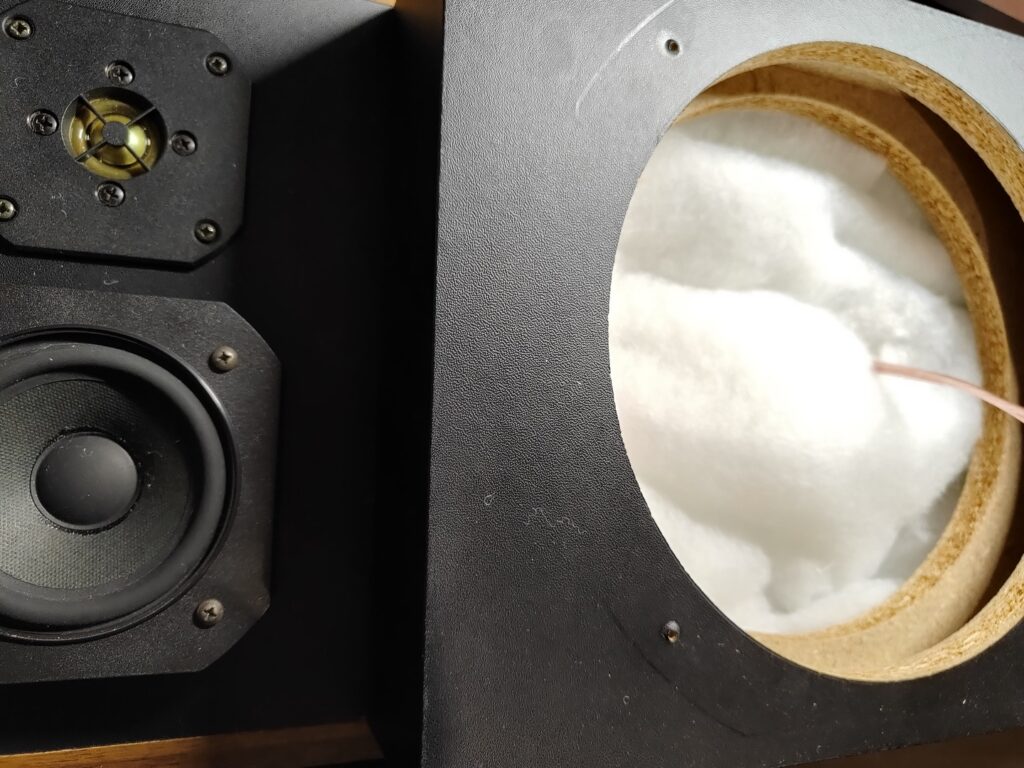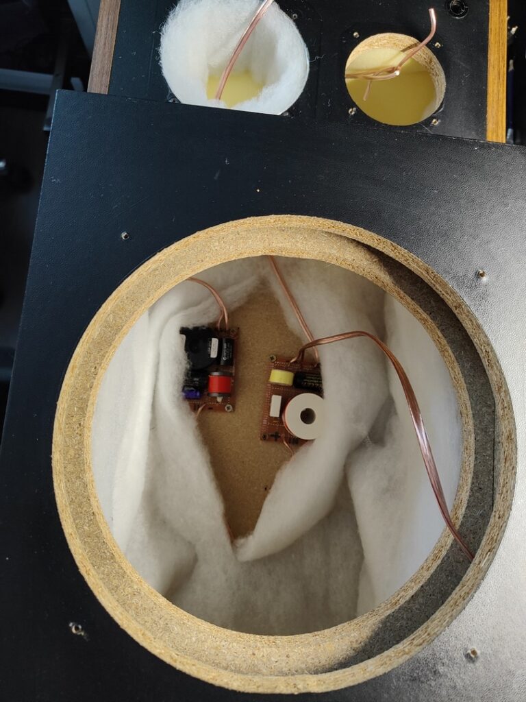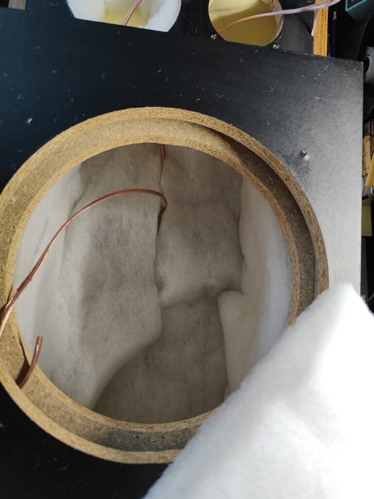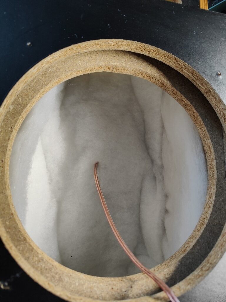Remontage terminé avec un remplissage total des enceintes avec une fibre type rembourrage (pas audio) ce n’est pas forcément la meilleures chose qui existe mais je n’avais que ça sous la main. Le but étant de remplir la cavité afin d’éviter les résonances et ralentir le son arrière nécessaire pour la décompression périphérique laminaire.