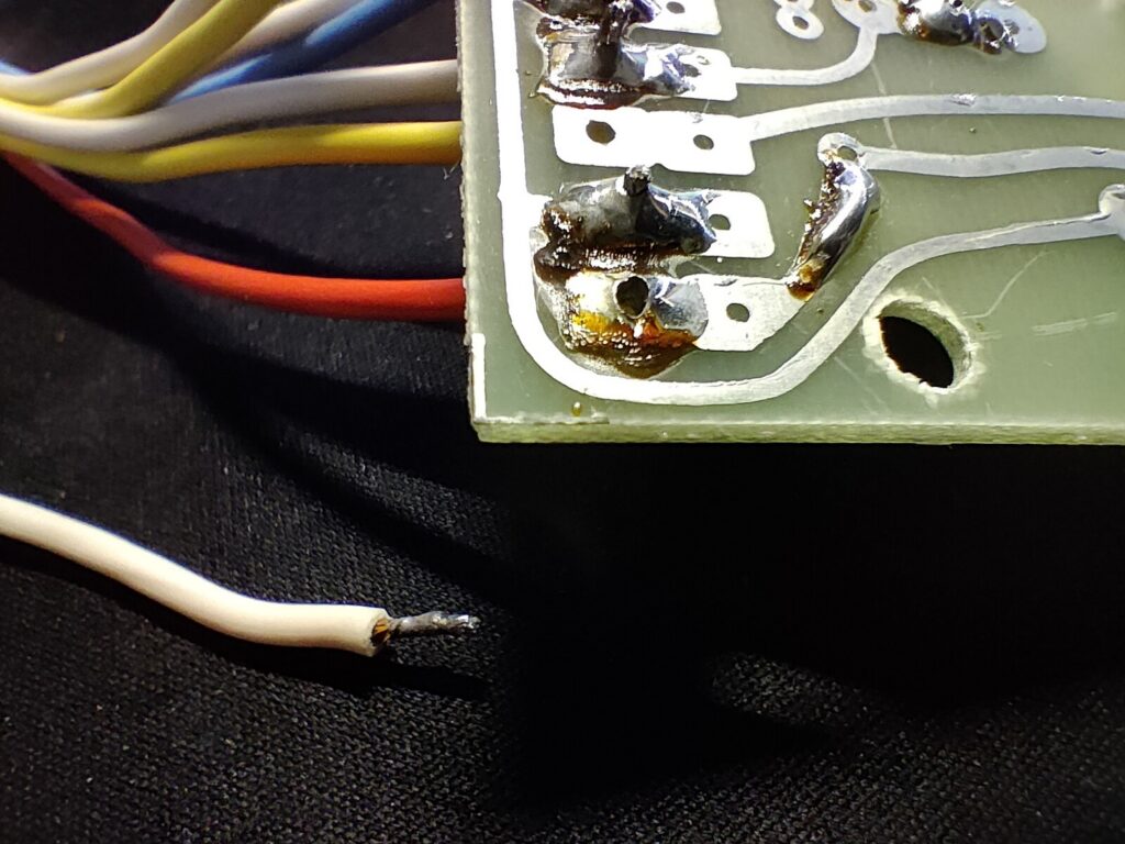 L’un des fils du tweeter avait une soudure sèche au point qu’il est tombé lors du démontage. Le contact devait être intermittent et surtout dysfonctionné lors des vibrations des basses.