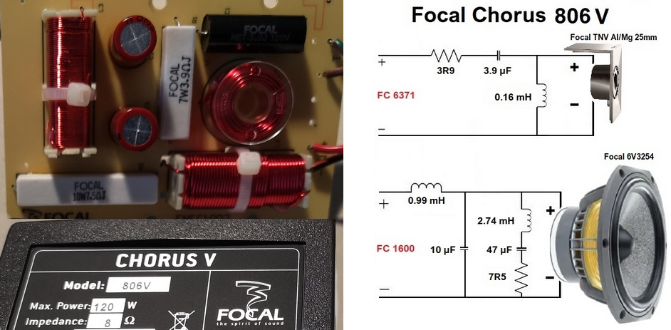 Pour le grave, un filtre à 12dB à condensateurs chimiques et selfs à noyau ferrite. Focal a pris soin d’ajouter un correcteur d’impédance RLC. Pour limiter les effets néfastes autour de la fréquence de résonance ou à l’extrémité de sa plage de fonctionnement ou encore pour ajuster la mise en phase, impossible de dire en l’état.