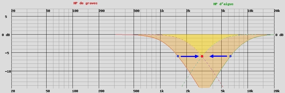 Sur le graphique nous voyons les pentes des deux filtres et leurs FC à – 6 dB (point bleu).