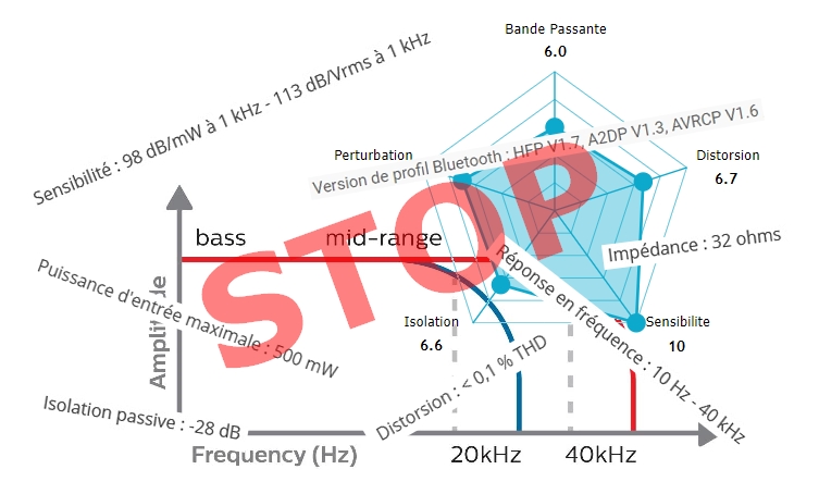 Quand je vois une note de 6/10 pour une bande passante annoncée de 16Hz à 20KHz cela me fait rigoler autant que cela me désespère. Ici la représentation est-elle une interprétation du journaliste ou une représentation des caractéristiques constructeur ? La bande passante audible pour l’homme est donnée pour 20Hz à 20KHz alors quelles doivent-être les caractéristiques pour une note de 10/10 ?