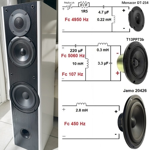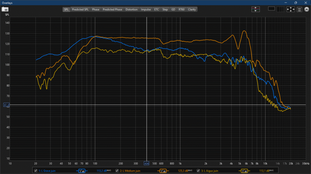 Mesures prises à quelques centimètres du centre de chaque HP après avoir déconnecté les 2 autres. Les HP déconnectés sont remis en place pour ne pas modifier l’acoustique de l’enceinte et pouvoir faire une mesure de l’HP dans les conditions de fonctionnement.