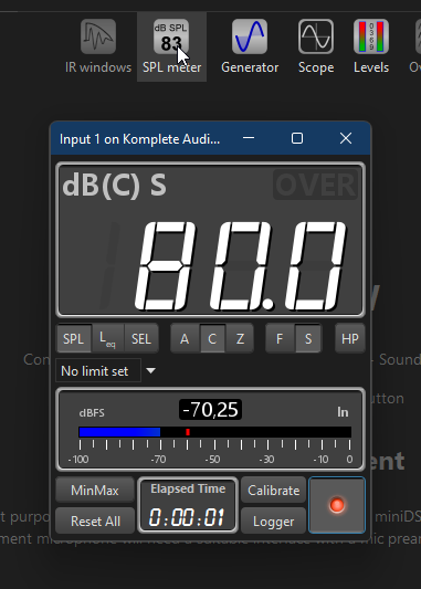 - Le calibrage du bruit de fond me pose un problème, je n’ai pas encore trouvé comment paramétrer Rew correctement avec la mesure prise par le sonomètre. Vu que ce n’est pas indispensable je laisse de côté, j’y reviendrai plus tard