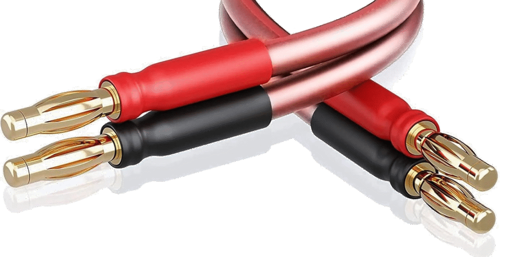 - En option, des câbles audio pour les mesures d’enceintes de passages, en plus du côté pratique, cela m’évitera de défaire mon câblage et de pouvoir facilement positionner les enceintes à mesurer. Le choix de fiches bananes permet un montage/démontage rapide. Privilégier le cuivre pure OFC avec une section 2 à 2.5mm² suffisante pour la plupart des enceintes hors matériels d’exceptions bien sûr.