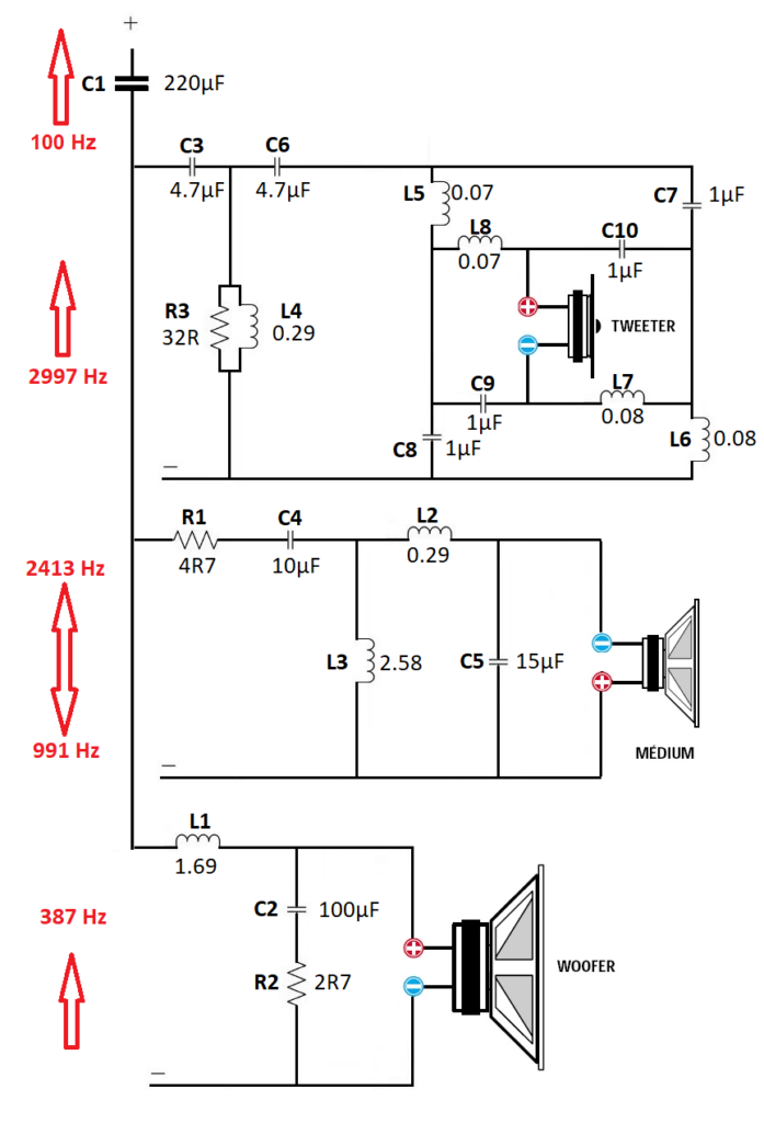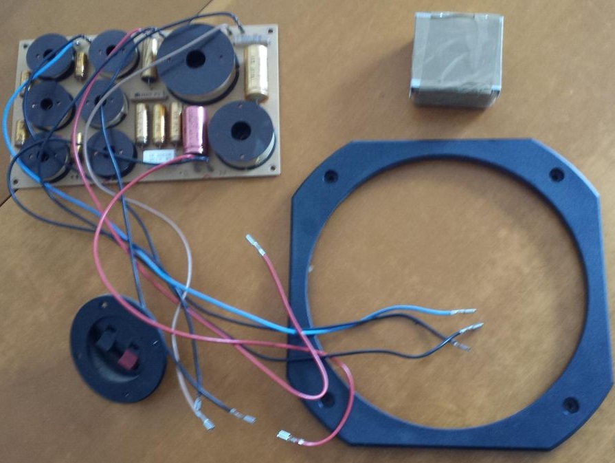 Le passe bande du médium est en 12 dB avec une inversion des polarités sur le HP. Merci à l’ancien propriétaire d’avoir identifier les couleurs des câbles lors du démontage.