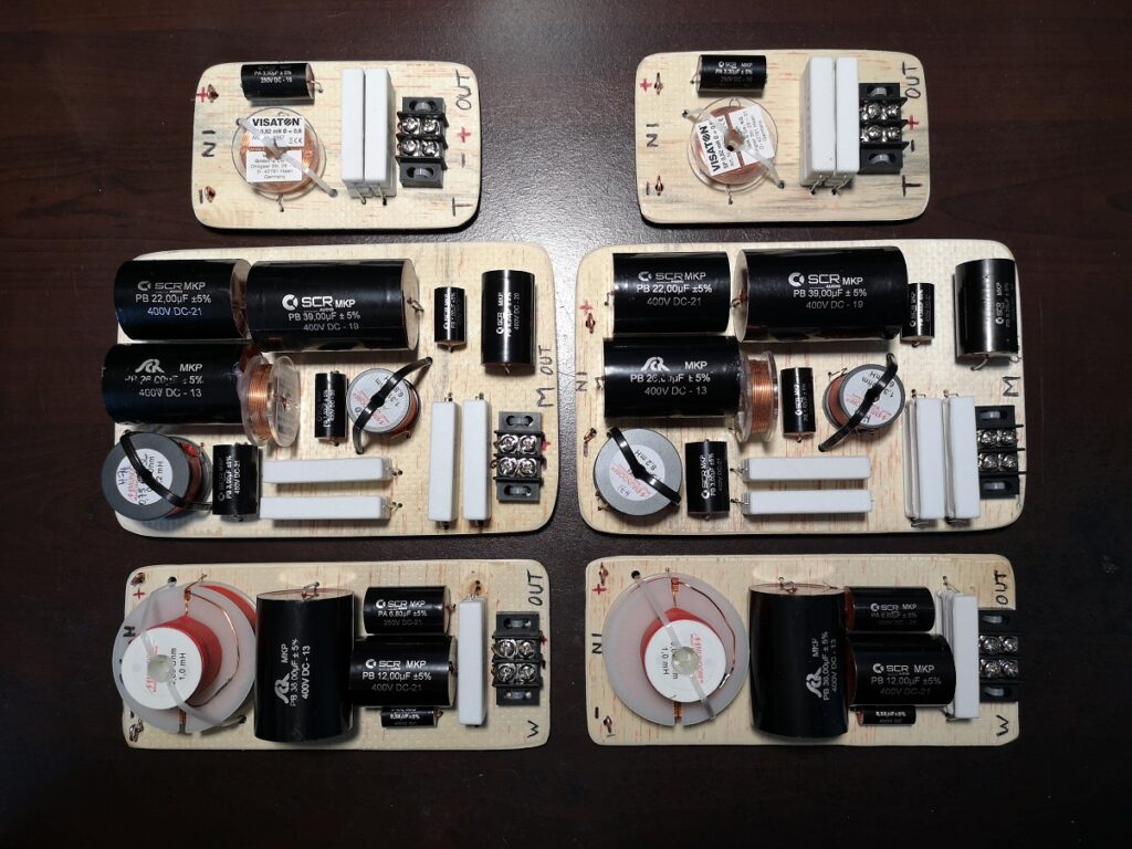 Premier pas, on remplacera les condensateurs qui ont un rôle primordiale dans le rendu final. Il y a énormément de modèles spécialisés pour le filtrage audio avec des caractéristiques différentes qui permettent l’orientation musicale que l’on souhaite avoir. Les prix sont aussi très différents selon les modèles et les plus chers ne seront pas forcément les meilleurs pour vos enceintes, tout est relatif puisqu’on peut même voir sur certain site une recommandation pour les condensateurs chimiques jusqu’à une certaine valeur (< 10µF). Personnellement je préfère les éviter le plus possible. Sachez rester raisonnable sinon le coût du filtre pourrait vite dépasser le prix des enceintes.