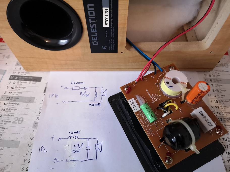 Je ne remplace que ces deux composants sur chaque filtre car je les ai en stock et que je peux tester immédiatement. Oui oui les puristes me diront que je dois aussi changer la valeur des composants en //… mais je n’en suis pas là, une chose après l’autre. N’ayant pas trouvé les caractéristiques précises des drivers, il serait fortuit de trouver une FC idéale. Je compte tester la capacité du tweeter à restituer les hauts aigus qui manquent cruellement et la capacité du woofer à délivrer les médiums oubliés par le filtrage.