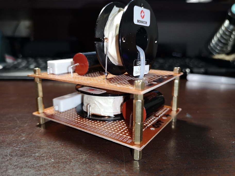 Montage avec colonnettes pour les tests, le montage final dans les HP se fera séparé. Dessous on retrouve le filtre grave et dessus le filtre aigus. Ça prend un peu plus de place mais j’arrive à les insérés en les mettant à la verticale, le tout bien enveloppé dans l’isolant phonique comme dans un petit nid douillet.